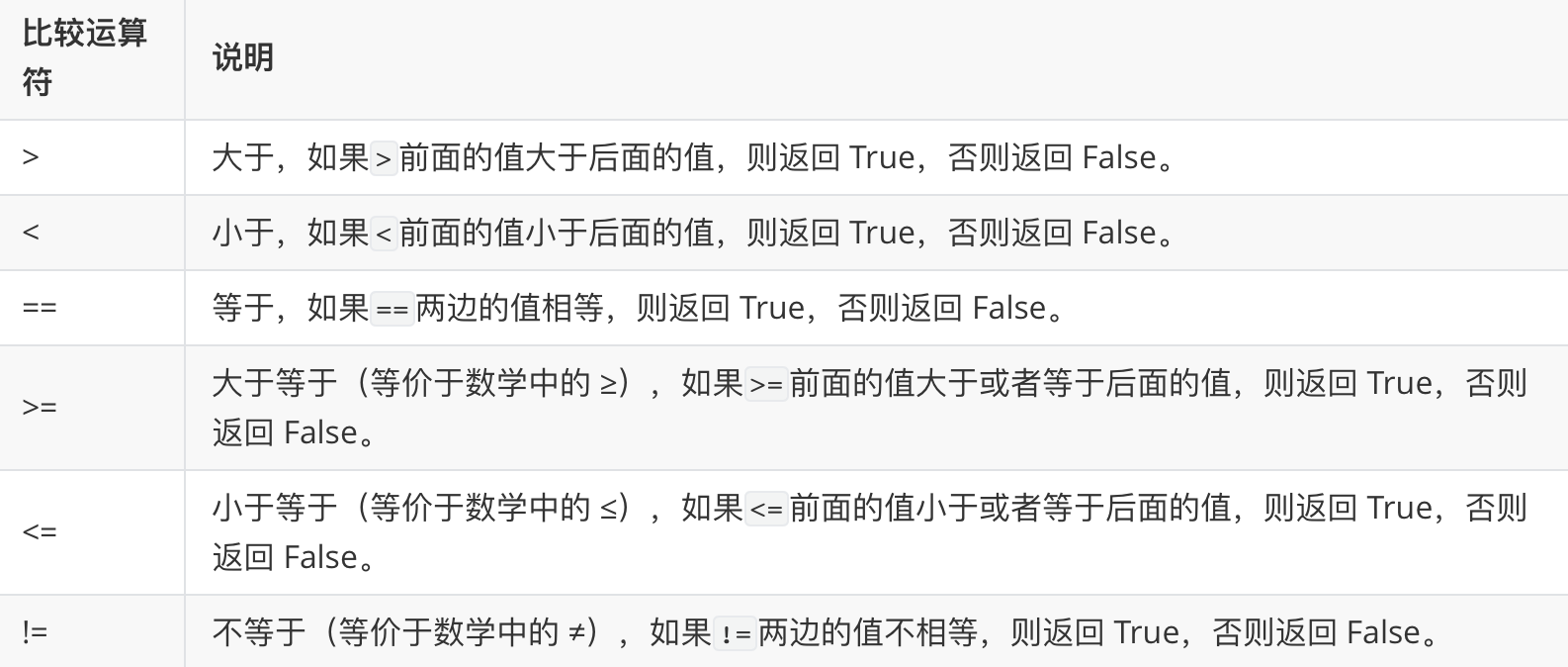 # > var1 = 15 var2 = 18 res = var1 > var2 print(res) # < res = var1 < var2 print(res) # >= 只要满足一个条件即为真 res = var1 >= 15 print(res)