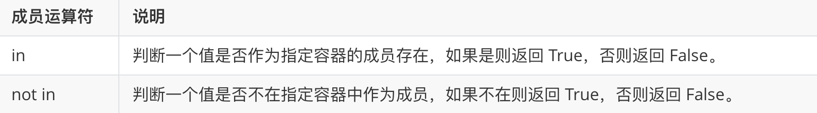 listvar = ["xiaoming","xiaobai","xiaohei"] res = "xiaobai" in listvar print(res) tuplevar = "xiaoA","xiaoW","xiaoK","xiaoF" res = "xiaoA" not in tuplevar print(res)