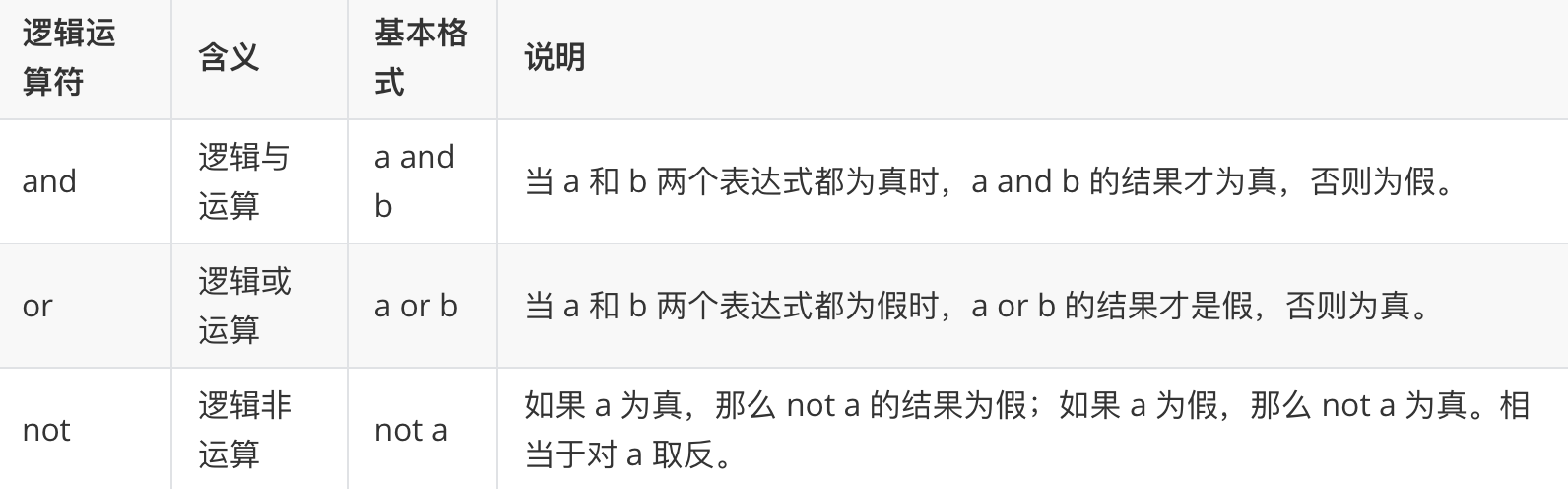 # (1)and 逻辑与 '''全真则真,一假则假''' res = True and True res = False and True res = False and False res = True and False print(res) # (2)or 逻辑或 '''全假则假,一真则真''' res = True or True res = True or False res = False or True res = False or False print(res) # (3)not 逻辑非 相当于取反 res = not True res = not False print(res)