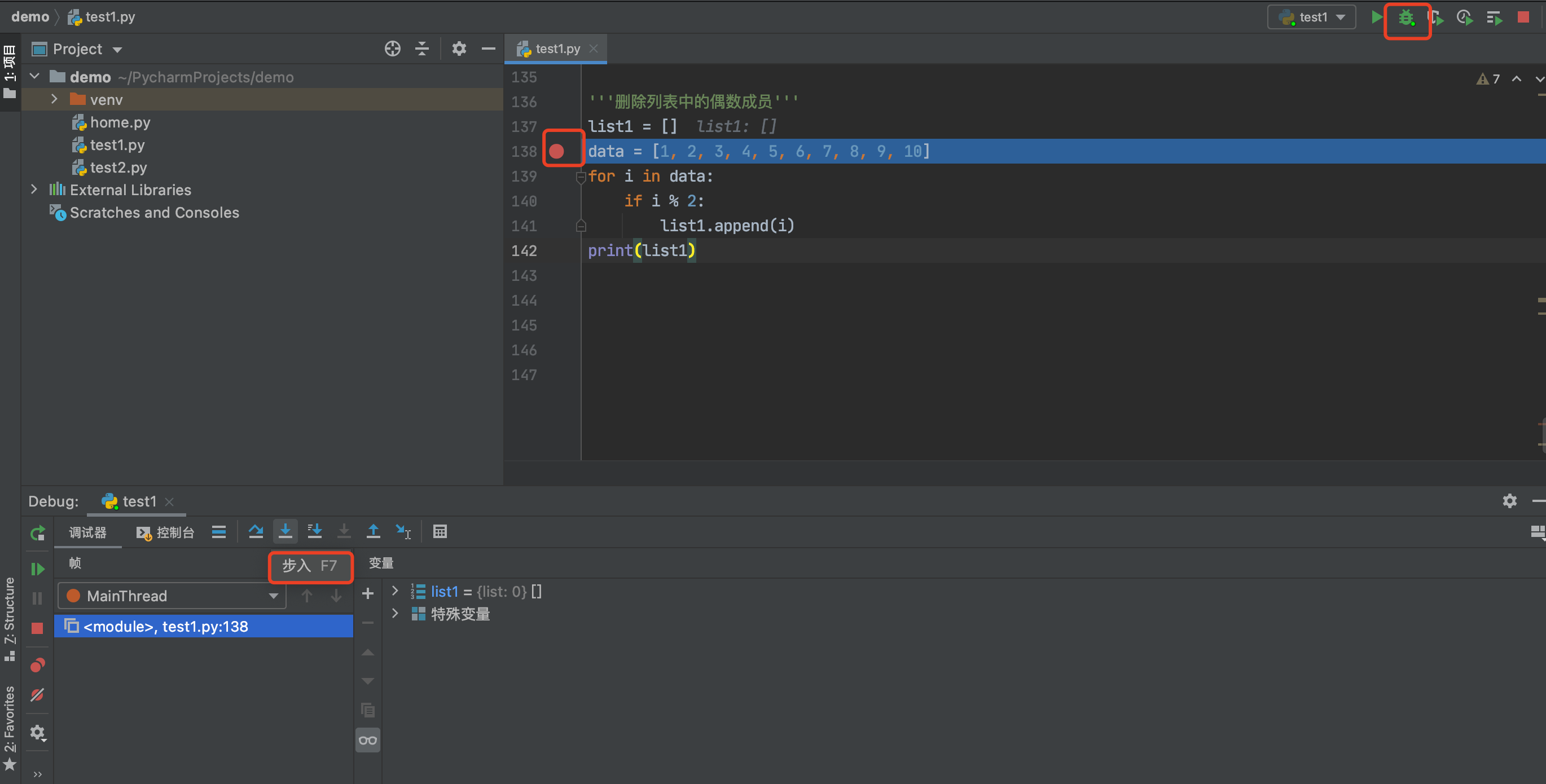 F8:让python执行下一句代码(能进入python内置代码也会进入)
