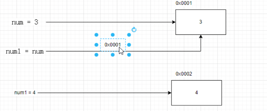 # python中的变量在第一次出现时,直接赋值,这个过程就是创建一个内存空间,并把数据保存进去。 num = 3 # 但是,如果该变量赋值过程中,=号右边的不是一个新数据,而是已经在内存中出现过的数据/变量,则这个过程是不会占用新的内存空间的。 num1 = num print(num, id(num)) #3 4561938800 print(num1, id(num)) #3 4561938800 # 这里重新修改了变量的指向,这里为什么num不跟着一起变化呢?原因是因为小数据池的机制导致的。4已经在内存中了。 # 因此形成的效果在于如果变量的值是一个数值、字符串类型,那么变量改值就会发生变量指向到其他的内存空间,但是不影响引用的变量。 num1 = 4 print(num1) # 4 print(num) # 3