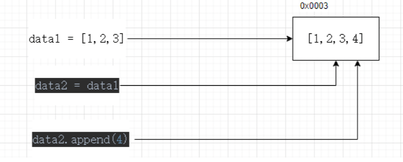 # 但是,针对于一些复杂的数据结构:字典,列表,集合,这几种就有区分了。以以下列表为例: # data1 = [1,2,3] # data2 = data1 # data2.append(4) # print(id(data2), data2) # 2722959468672 [1, 2, 3, 4] # print(id(data1), data1) # 2722959468672 [1, 2, 3, 4]