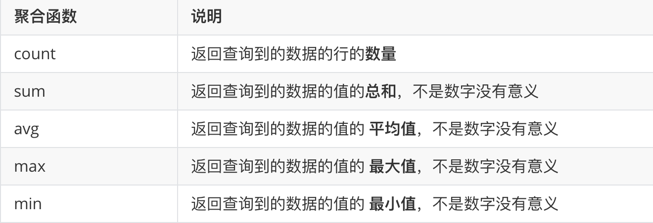 SELECT 聚合函数("字段") FROM 表名 WHERE 条件; SELECT 聚合函数("字段"),其他字段列表 FROM 表名 WHERE 条件; |