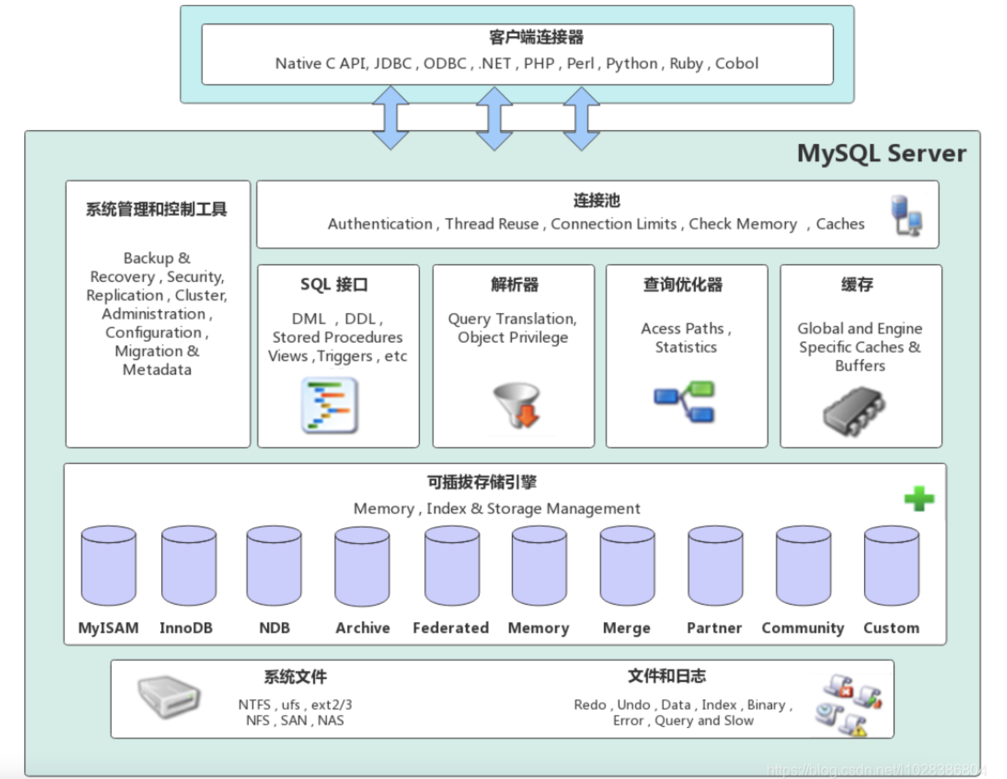 从上面的架构图,我们可以看出MySQL的架构自上向下大致可以分为连接层、服务层、引擎层和文件层四大部分。对外暴露的是连接层,连接层调用SQL查询接口,交给服务层。
