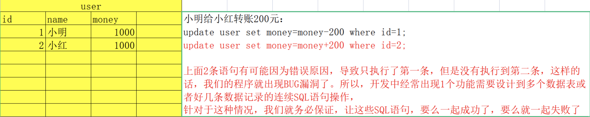 事务可以让多条写操作(添加、删除、修改)的SQL语句以一个整体的方式在mysql内部执行,保证多条SQL语句要么一起执行成功,要么一起执行失败!