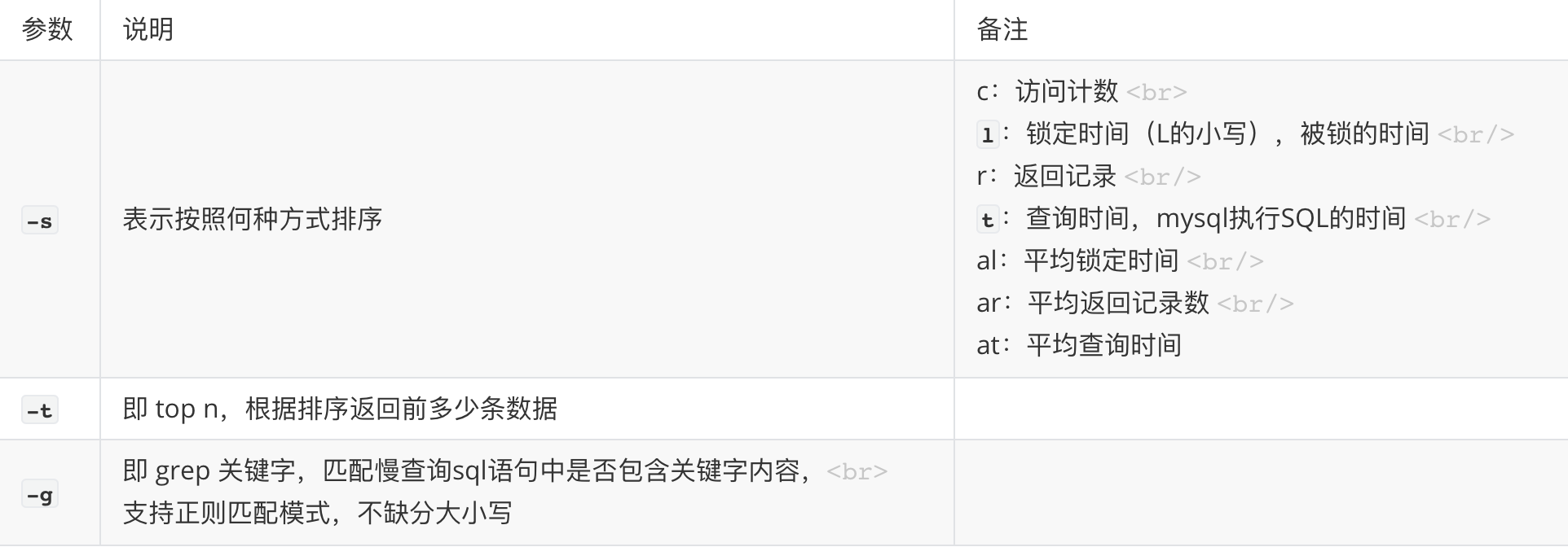 -- 查看慢查询日志的开启情况 show variables like '%slow_query%'; -- 设置临时开启 set global slow_query_log=1; set long_query_time=2; # mysql终端下可以通过sleep睡眠函数模拟慢查询 select sleep(10); # 查看所有慢查询SQL语句的记录信息 sudo mysqldumpslow /var/lib/mysql/ubuntu-slow.log # 得到返回记录数量最多的20个: sudo mysqldumpslow -s r -t 20 /var/lib/mysql/ubuntu-slow.log # 得到平均访问次数最多的20条: sudo mysqldumpslow -s ar -t 20 /var/lib/mysql/ubuntu-slow.log # 得到平均访问次数最多,并且里面含有 xxx字符的20条 sudo mysqldumpslow -s ar -t 20 -g "xxx" /var/lib/mysql/ubuntu-slow.log 慢日志分析工具(mysqldumpslow)参数说明