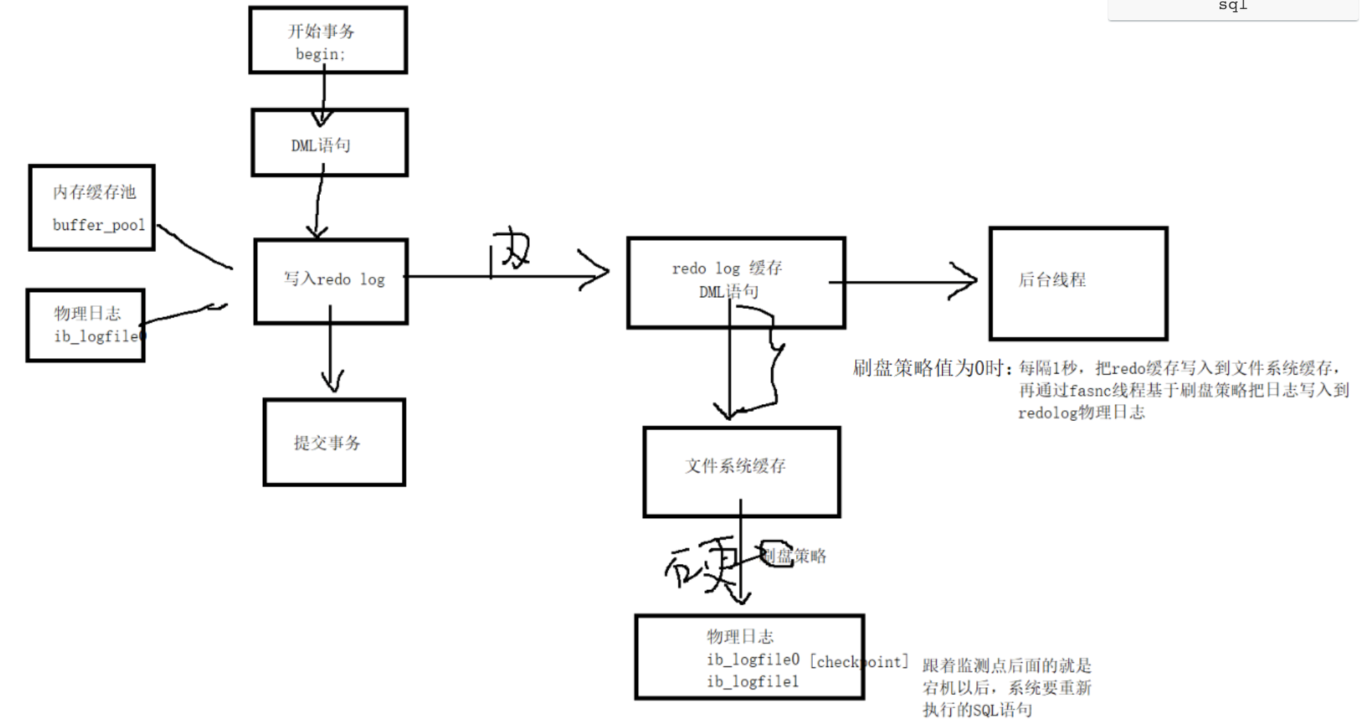 对于一个已经提交的事务,在事务提交后即使系统崩溃或宕机了,这个事务对数据库中所做的更改也不能丢失。Mysql为了提高性能使用了 BufferPool (缓存池),事务会先修改或读取 BufferPool 中的数据,如果内存中不存在当前要操作数据,会从硬盘读取到内存的 BufferPool 中。Mysql 在 更新记录写入 BufferPool 之前会把记录先写到 redolog (重做日志),当事务提交时会先将 redolog 通过刷盘机制持久化到硬盘,如果出现宕机,mysql重启后将 redolog 中的事务重放执行。 InnoDB中基于事务实现,提供了2个事务日志,redo log(重做日志) 和 undo log(回滚日志),其中redo log 分2部分,其中逻辑日志(redo log buffer,重做日志缓冲)与 物理日志(保存在硬盘中,ib_logfile0、ib_logfile1),而undo log则属于逻辑日志,保存缓冲区的表空间。