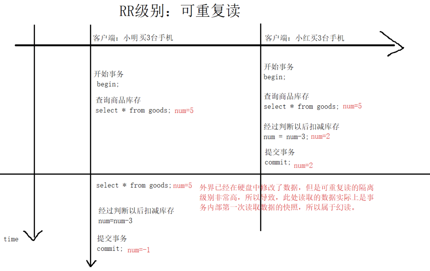 不可重复读:指在一个事务内,多次读同一数据。在这个事务还没有结束时,另外一个事务也访问该同一数据。那么,在第一个事务中的两次读数据之间,由于第二个事务的修改,那么第一个事务两次读到的的数据可能是不一样的。这样就发生了在一个事务内两次读到的数据是不一样的。不可重复读的重点是修改,同一事务,两次读取到的数据不一样。