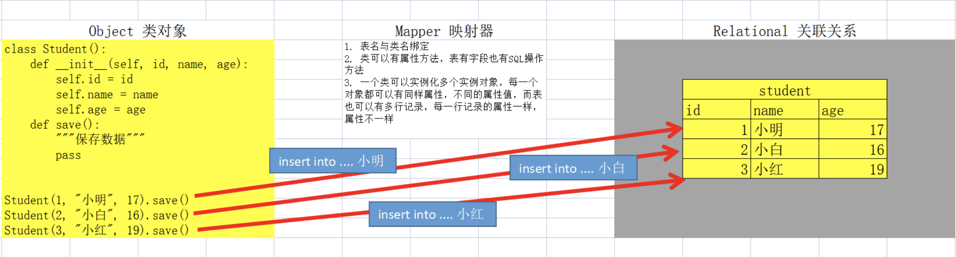 ORM框架会帮我们把类对象和数据表进行了一对一的映射,让我们可以通过类对象提供的属性或方法就可以操作对应的数据表。在项目内嵌ORM框架,这样就可以不需要直接编写SQL语句进行数据库操作,而是通过定义模型类对象,操作模型类对象即可完成对数据库中数据的增删改查和数据表的创建删除等操作。参考下图: