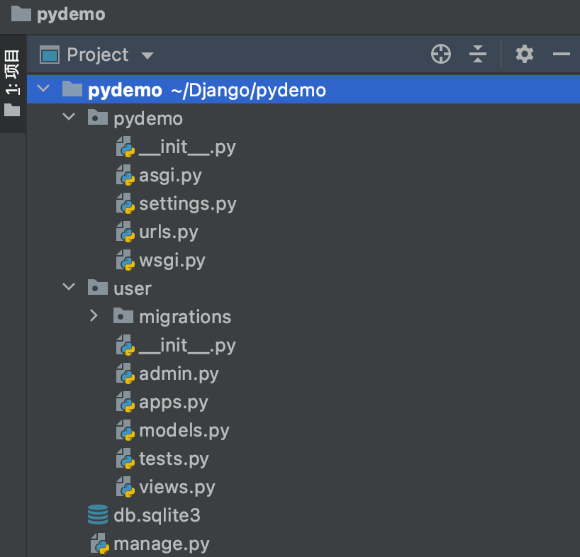 - 内层pydemo # 主应用开发目录,保存了项目中的所有开发人员编写的代码, 目录是生成项目时指定的