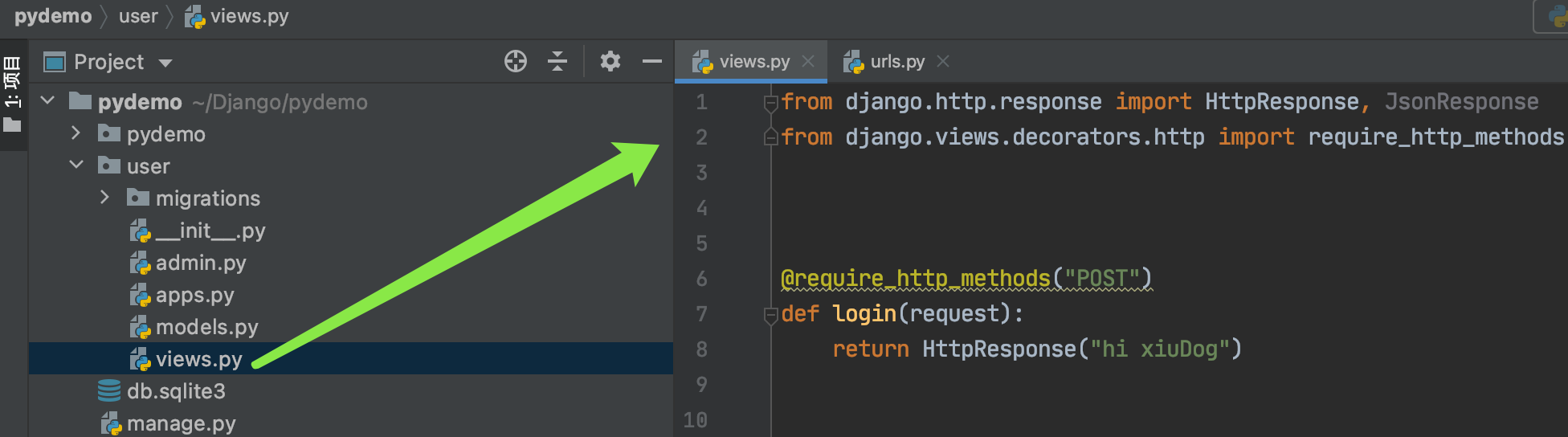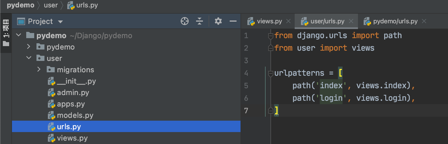 2 在子应用user下创建子路由文件urls.py,并和其下面的视图文件view.py绑定代码