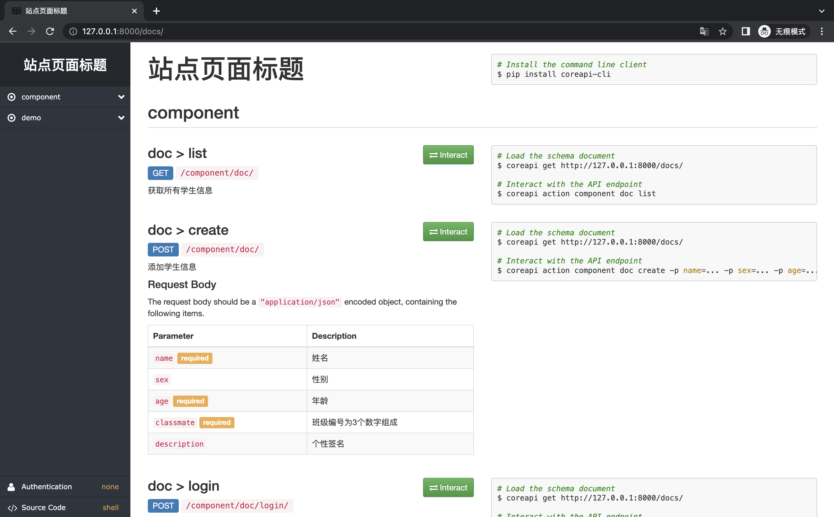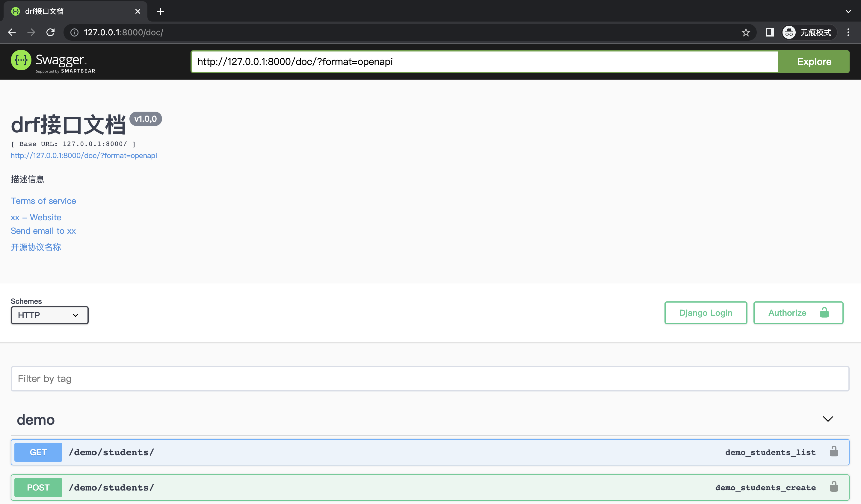 浏览器访问 127.0.0.1:8000/doc/,查看自动生成的接口文档。