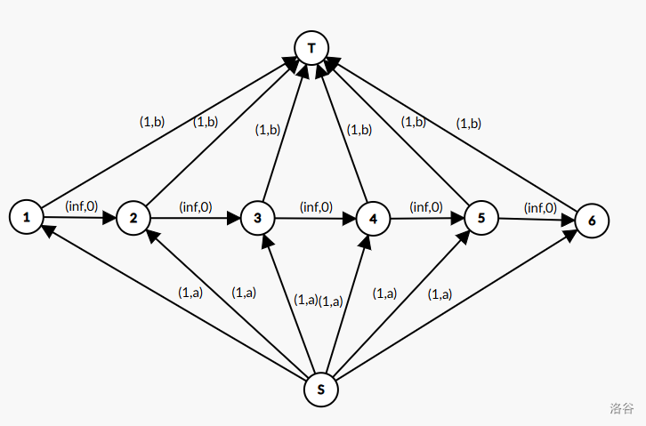 - 第 \(i\) 天向汇点连流量为 \(1\) ,费用为 \(b_i\) 的边。
