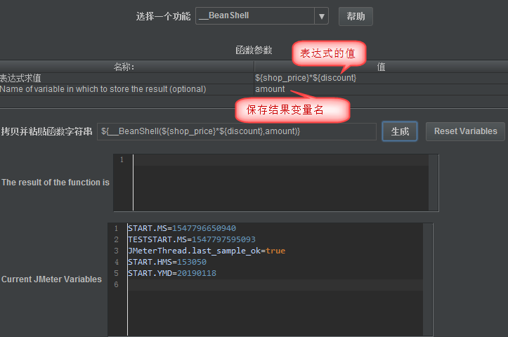 它有两个参数,第一个参数是要执行的语句,可以是beanshell语句或者是文件地址,是必选参数;第二个参数是保存结果的变量名称,非必选参数。