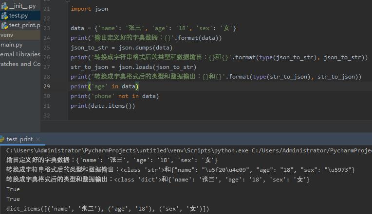 import json data = {'name': '张三', 'age': '18', 'sex': '女'} print('输出定义好的字典数据:{}'.format(data)) json_to_str = json.dumps(data) print('转换成字符串格式后的类型和数据输出:{}和{}'.format(type(json_to_str), json_to_str)) str_to_json = json.loads(json_to_str) print('转换成字典格式后的类型和数据输出:{}和{}'.format(type(str_to_json), str_to_json)) print('age' in data) print('phone' not in data) print(data.items()) print(json_to_str.startswith("{", 0, 5)) print(json_to_str.endswith('}', 1, 10))