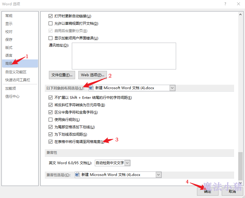 3.第二步:打开word文档,点击文件→选项→高级→找到“以下对象的布局选项”下,找到在表格中将行高调至网格高度,勾选,确定,OK,解决!!