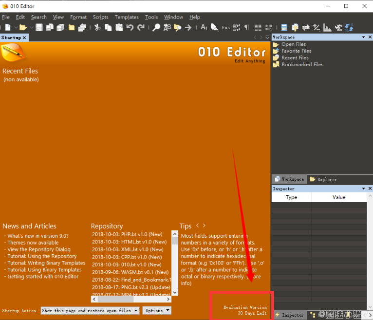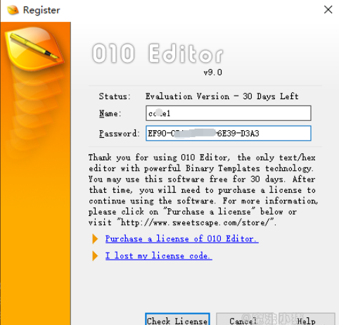 打开安装的010 editor软件,右下角有个“30 Days Left”,没破解的可以试用30天。