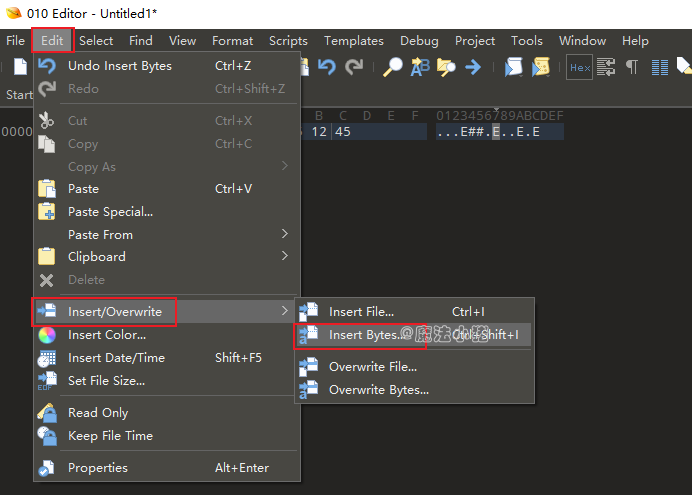 菜单栏edit->insert/Overwrite->Insert Bytes