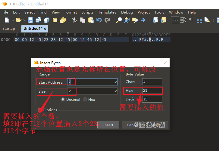 例如:size填3,hex值填23,执行后,会在7的位置,插入3个23。