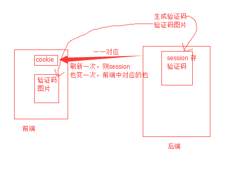 1、页面一加载,img的src会向后台发送一个请求,后台接受请求会生成一个验证码和验证码图片。验证码图片直接返回给img标签,同时生成的验证码会存入到session中(session在后台将验证码存入,同时生成一个cookie到前端页面。)