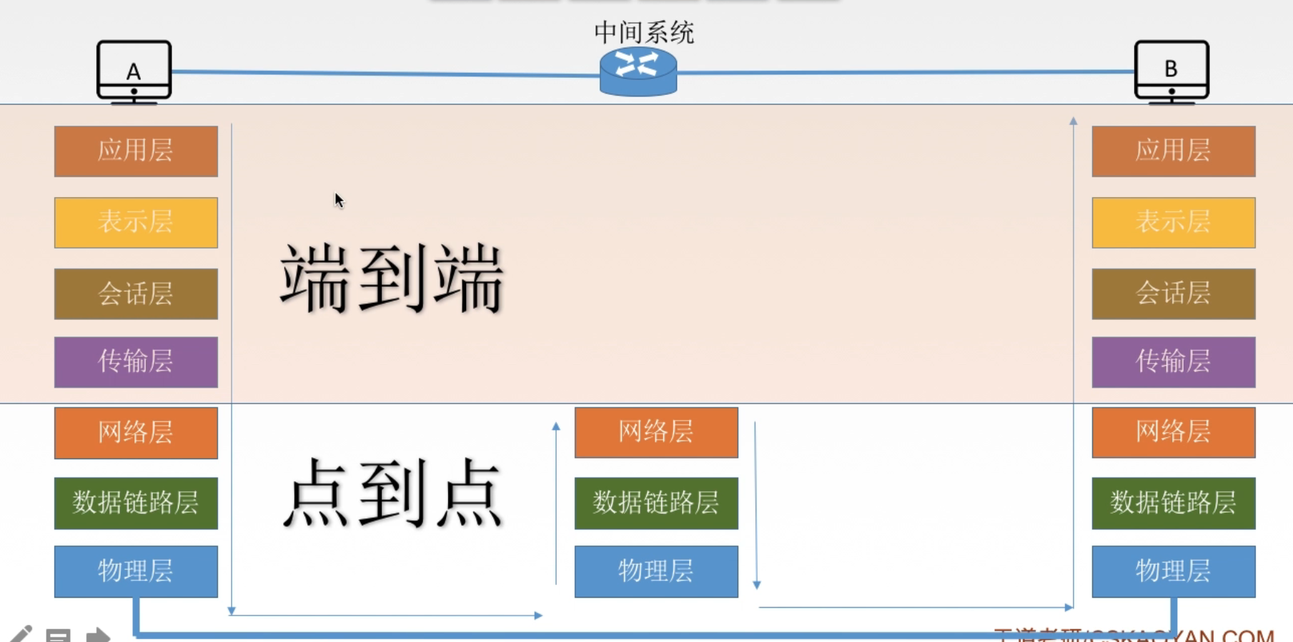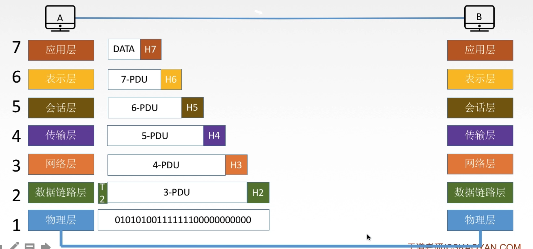 由A端发送一个信息,则由顶端的应用层开始,每一层加一些信息(but物理层不处理数据)--------信息来到中间层(1还原:物理层到数据链路层再到网络层+2 处理 由网络层封装处理至链路层再到物理层)-------信息来到B端(一步步向上还原数据)