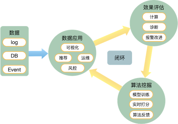 数据驱动型应用是数据驱动的体现形式。从数据到应用,它是一个不断进化的过程。如下图,主要包含这四步:数据获取、数据应用、效果评估、算法挖掘。通过数据采集得到日志数据、关系型数据、事件数据。基于决策模型和算法,形成具体的应用和产品,包括可视化类、推荐类、客服类、风控类、保险类等产品。再通过效果评估和算法挖掘形成的闭环,自动调整模型、改进结果。