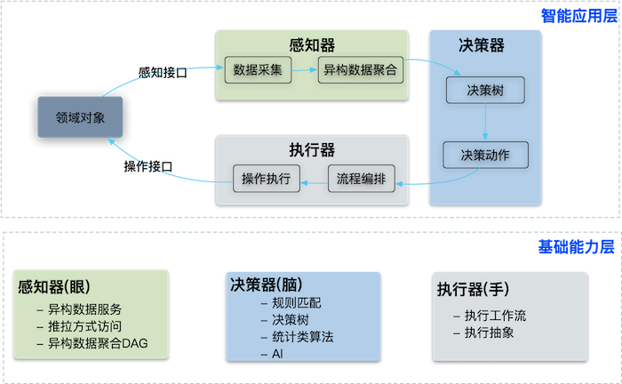 每个智能应用都可以分解为感知器(眼)、决策器(手)、执行器(脑)。如下图,基础能力层提供这3类基础能力,智能应用层使用这3类基础能力,快速组装成需要的各种智能应用。
