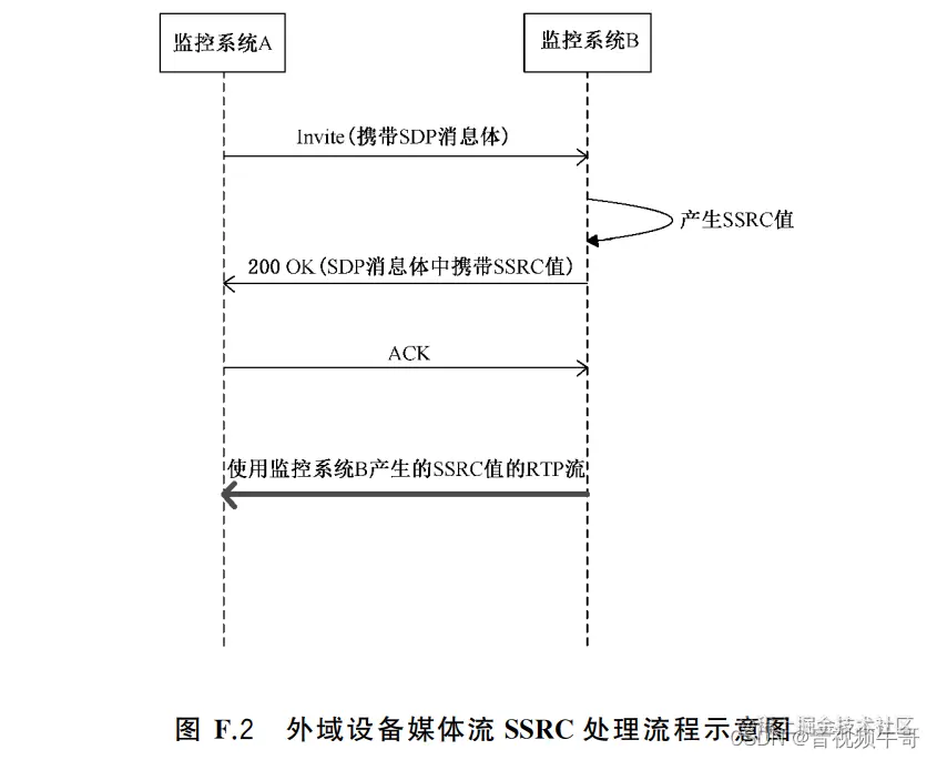点播域内设备媒体流时,SSRC值由本域监控系统产生并通过Invite请求发送给设备使用,设备在回复的200 OK消息中携带此值,设备在发送的媒体流中使用此值作为RTP的SSRC值。流程图见图 F.1。
