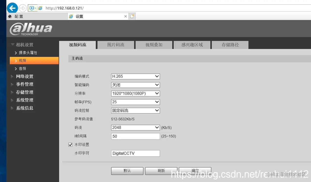 主码流:rtsp://admin:admin123456@192.168.0.121:554/cam/realmonitor?channel=1&subtype=0