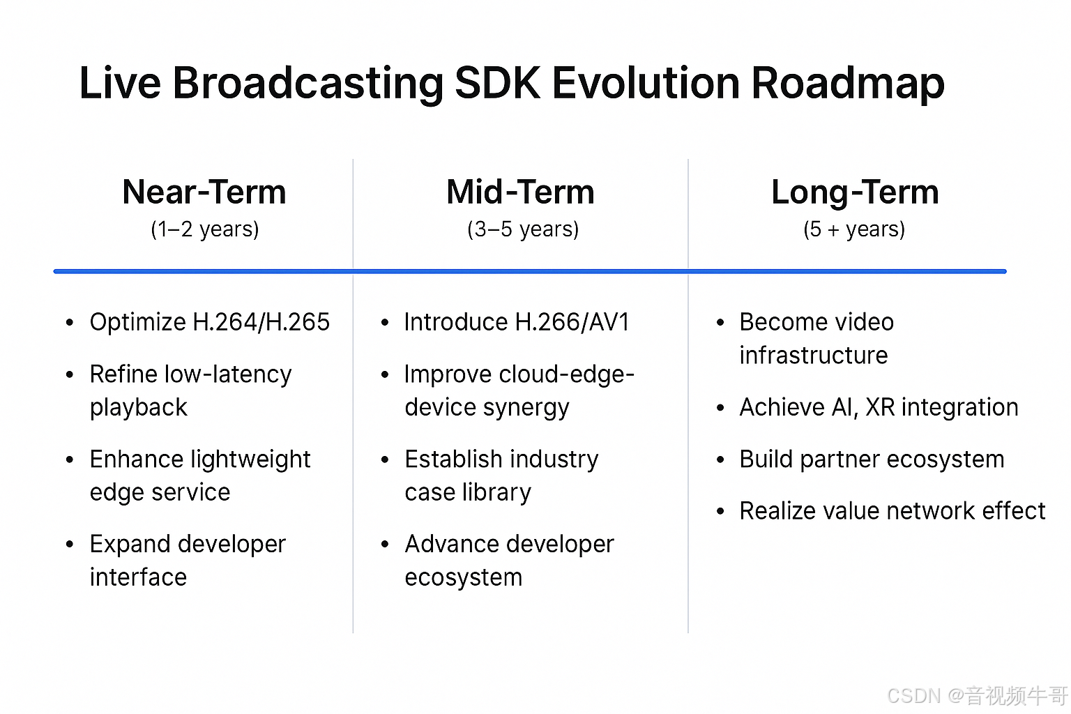 从 Near-Term 的基础优化,到 Mid-Term 的编解码升级与行业融合,再到 Long-Term 的生态闭环与价值增值,大牛直播SDK的规划路径非常清晰: