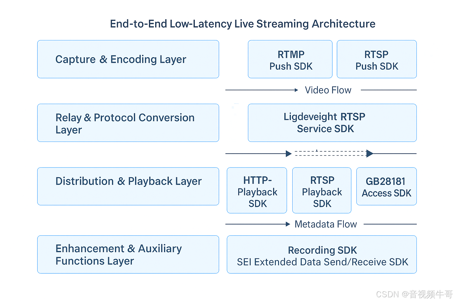 大牛直播SDK未来的演进,不会一味追逐“全能”,而是坚持 低延迟、跨平台、模块化 的核心优势,在 编解码优化、云边端协同、开发者生态 三条主线上稳步推进。