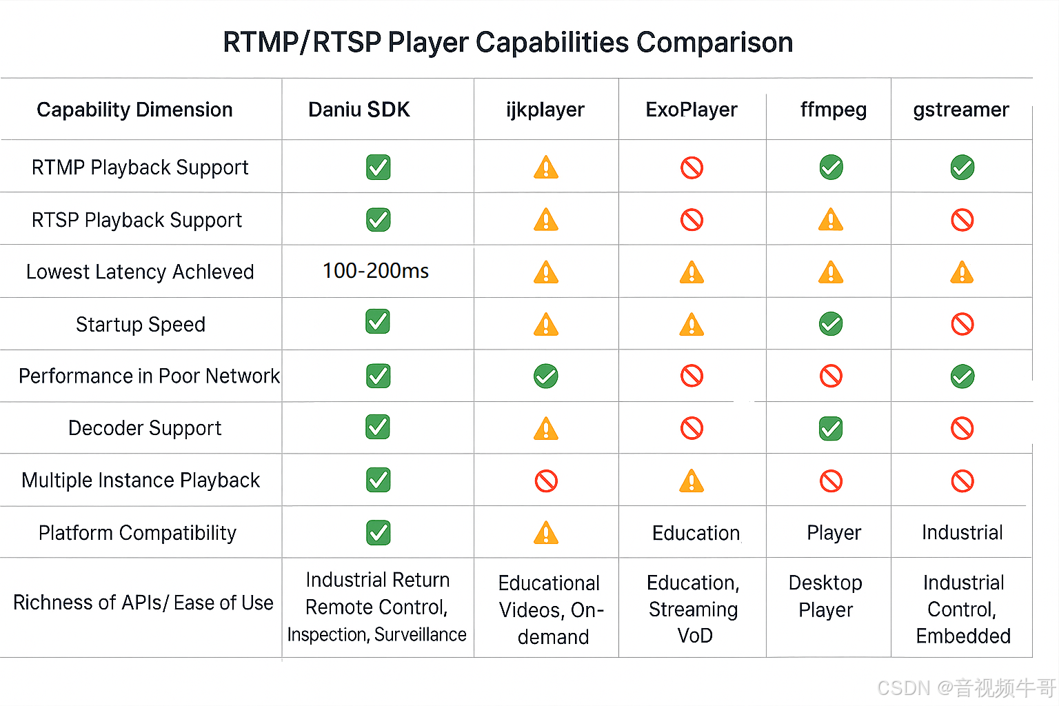 ijkplayer、ExoPlayer、ffmpeg、VLC、gstreamer等):具备一定可用性,适合入门、教学和简单场景,但在弱网适应性、专业功能深度、可维护性等方面存在短板。