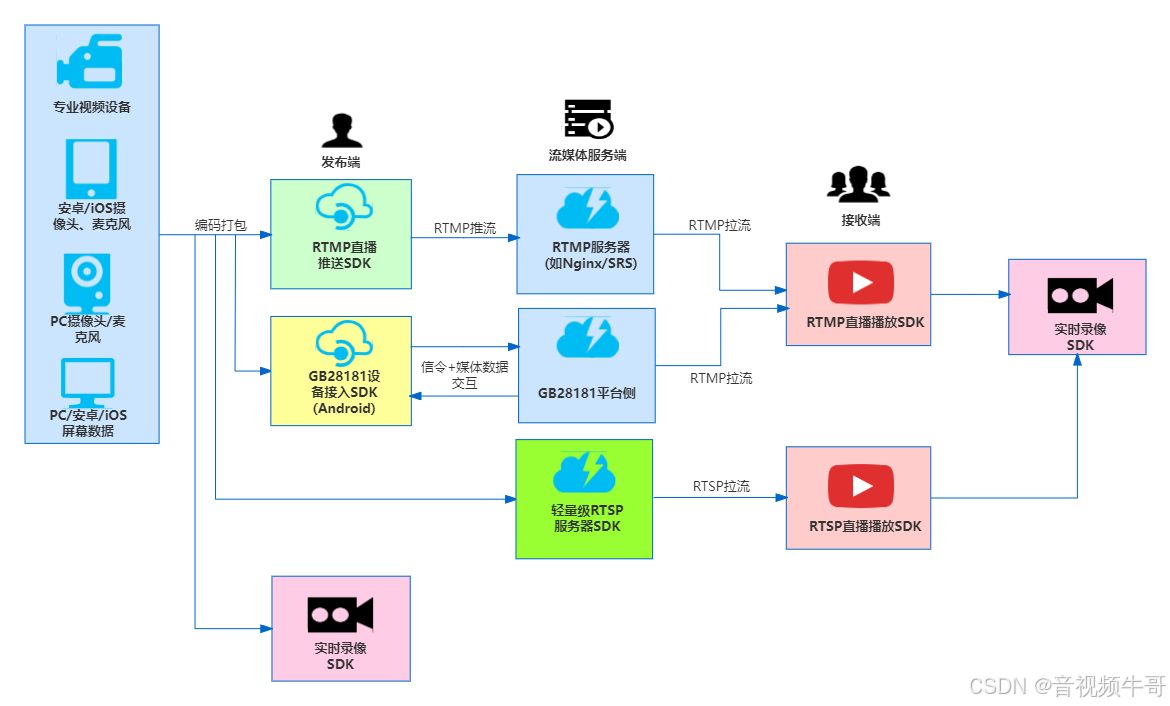在无人巡检业务链路中,大牛直播SDK发挥着关键的技术支撑作用。首先,超低延迟的视频传输能力是系统稳定运行的基础。通过RTSP协议,在局域网或专网环境下,SDK可实现端到端延迟稳定在150ms以内,保障视频画面的实时性与操控同步性。RTMP协议则适用于公网或云平台转发,配合SDK的延迟优化与自适应机制,可将公网延迟控制在秒级范围内,满足远程调度与协同作业需求。