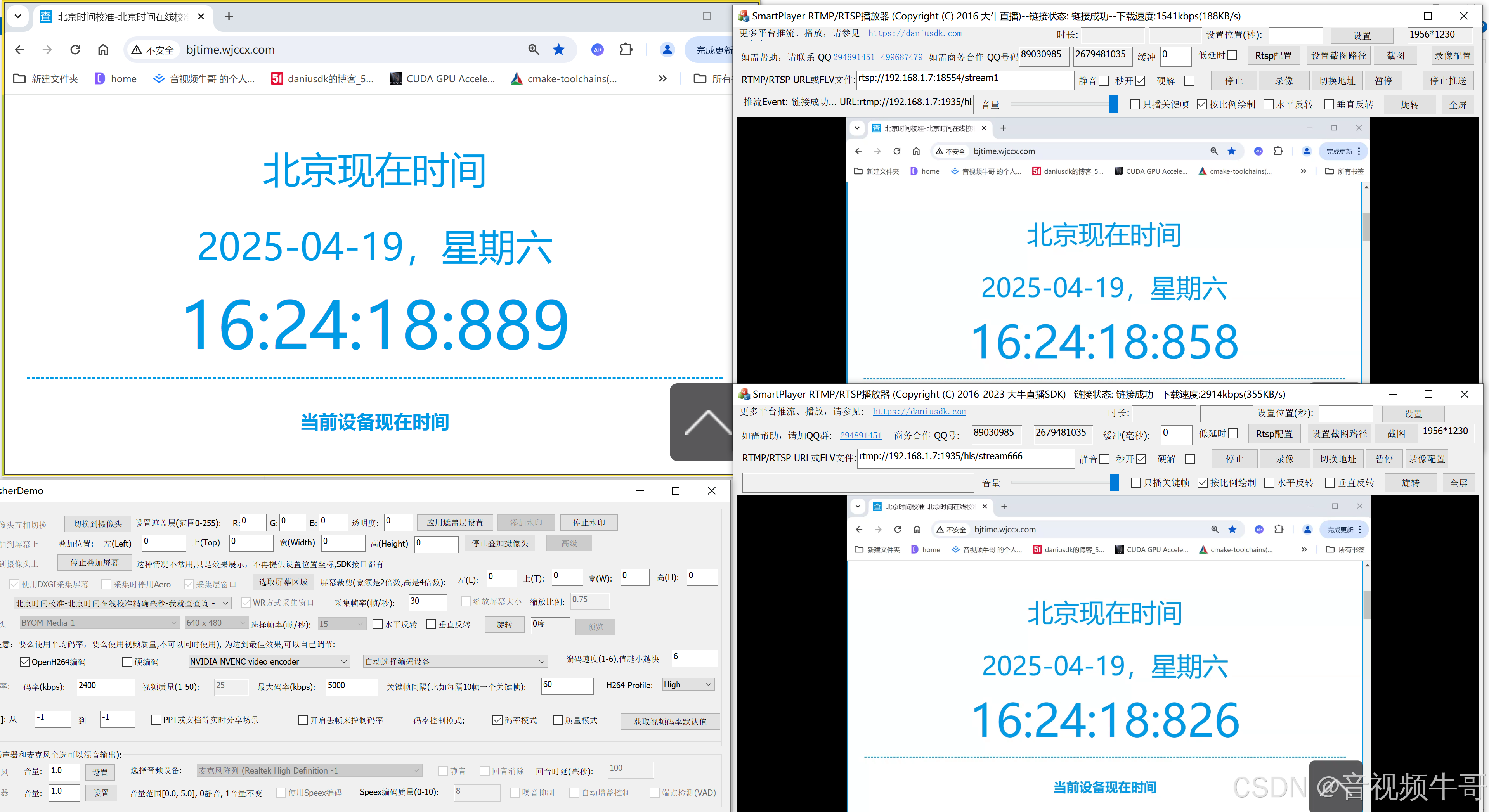 大牛直播SDK作为一套跨平台高性能视频采集/播放/回调 SDK,提供了灵活、稳定、高频可控的视频帧输入能力,在长尾识别问题中具备极大工程价值(左侧是原始的数据窗口,右上是播放rtsp流并回调yuv、rgb数据,右下是二次处理后的数据转RTMP推送后播放):