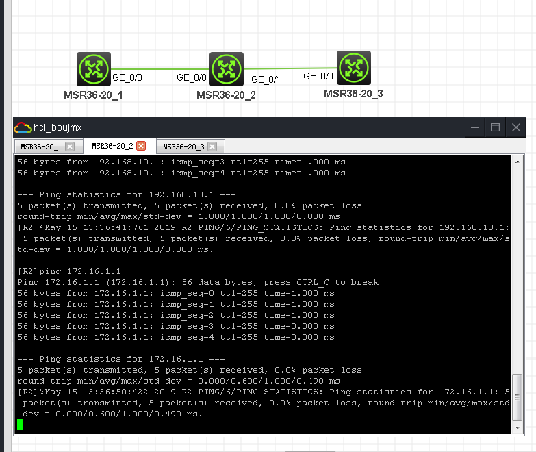 接着测试R1能不能ping通ip172.16.1.1,R2ping通192.168.10.1和172.16.1.1,R3ping通192.168.10.1