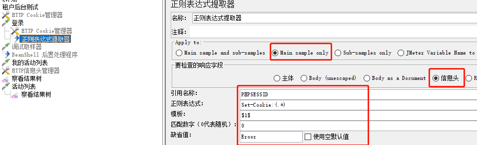 二、右击“登录”-添加-后置处理器-选择“正则表达式提取器”进行提取响应信息头中Cookie的值