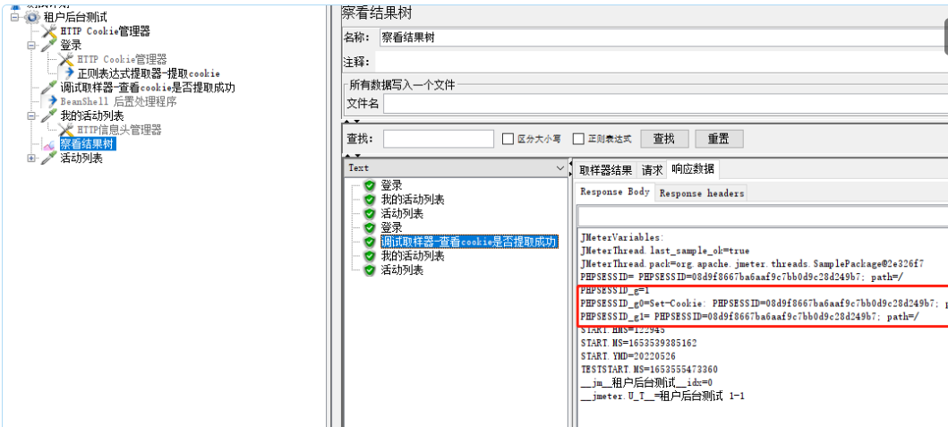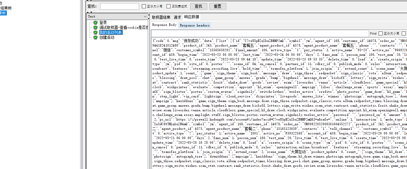 六、此时重新运行,发现活动列表查询已经获取到cookie且响应数据成功获取,此时就已经成功获取登录接口响应头中的cookie并使其与其他接口完成关联了
