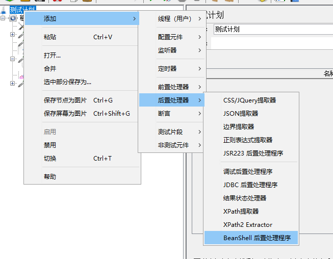 四、此时需要添加BeanShell 后置处理程序来处理提取到的Cookie 添加方式:右击测试计划-添加-后置处理器-BeanShell 后置处理程序