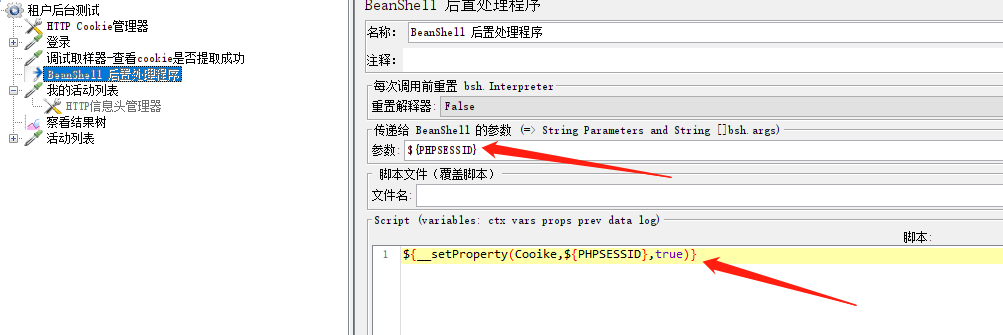 2)Script中输入:${__setProperty(Cooike,${PHPSSIONID},true)}