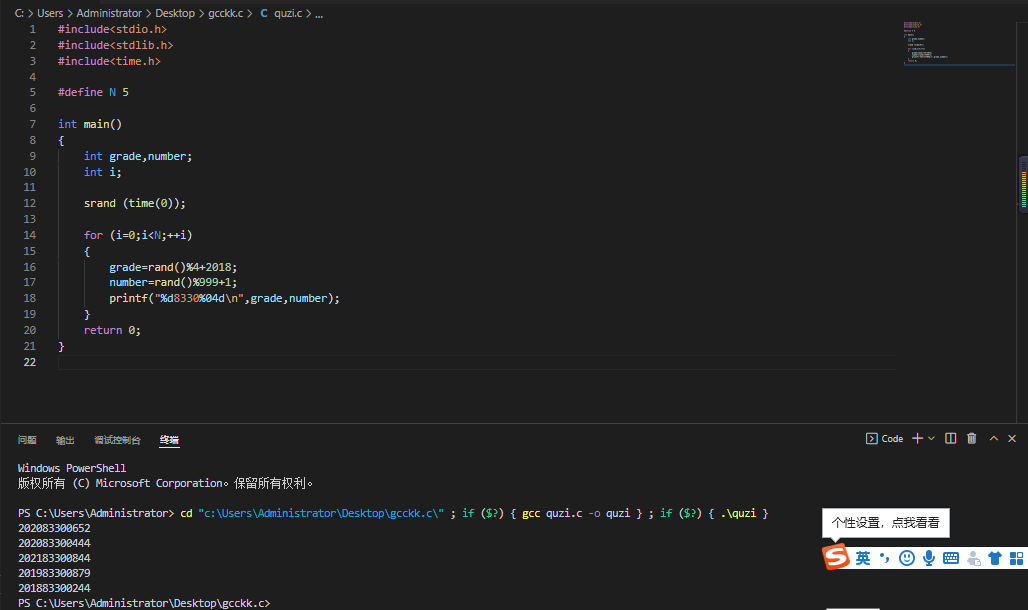 #include<stdio.h> #include<stdlib.h> #include<time.h> #define N 5 int main() { int grade,number; int i; srand (time(0)); for (i=0;i<N;++i) { grade=rand()%4+2018; number=rand()%999+1; printf("%d8330%04d\n",grade,number); } return 0; }