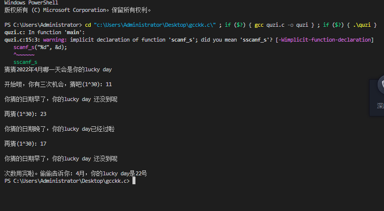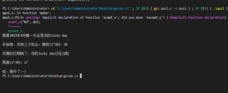 #include <stdio.h> #include <stdlib.h> #include <time.h> #define N 3 int main() { int ld, d,i,n=0; srand(time(0)); ld = rand() % 30 + 1; printf("猜猜2022年4月哪一天会是你的lucky day\n\n"); printf("开始喽,你有三次机会,猜吧(1^30):"); for (i = 0; i < N; ++i) { scanf_s("%d", &d); if (d == ld) { printf("\n哇,猜中了:-)\n"); break; } if (d > ld) { printf("\n你猜的日期晚了,你的lucky day已经过啦\n"); } else { printf("\n你猜的日期早了,你的lucky day 还没到呢\n"); } n++; if(n<N) { printf("\n再猜(1^30):"); } else { printf("\n次数用完啦。偷偷告诉你:4月,你的lucky day是%d号\n", ld); } } return 0; }