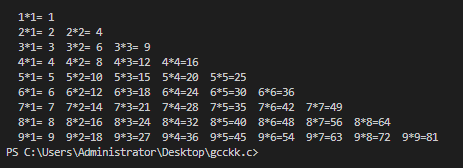 #include<stdio.h> #include<stdlib.h> int main() { int i,j,n=10; for(i=1;i<n;i++) { for(j=1;j<=i;j++) { printf("%3d*%d=%2d",i,j,j*i); } printf("\n"); } return 0; }