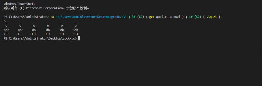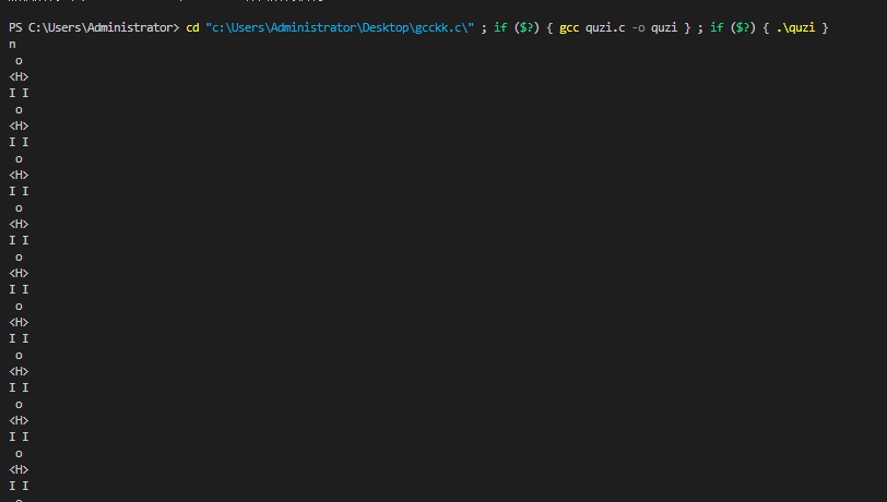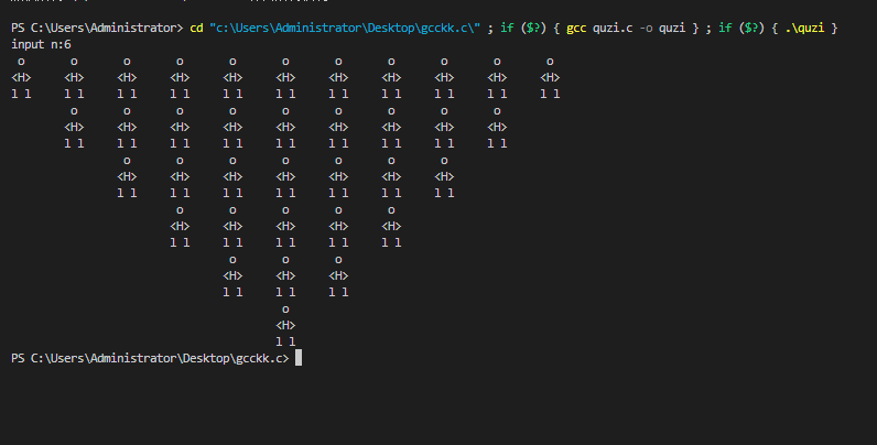 #include <stdio.h> int main() { int n, i, j; printf("input n:"); scanf("%d", &n); for (i = 1; i <= n; i++) { for (j = 1; j < i; j++) { printf(" \t"); } for (j = 1; j <= 2*(n-i) + 1; j++) { printf(" o\t"); } printf("\n"); for (j = 1; j < i; j++) { printf(" \t"); } for (j = 1; j <= 2*(n-i) + 1; j++) { printf("<H>\t"); } printf("\n"); for (j = 1; j < i; j++) { printf(" \t"); } for (j = 1; j <= 2*(n-i) + 1; j++) { printf("l l\t"); } printf("\n"); } return 0; }