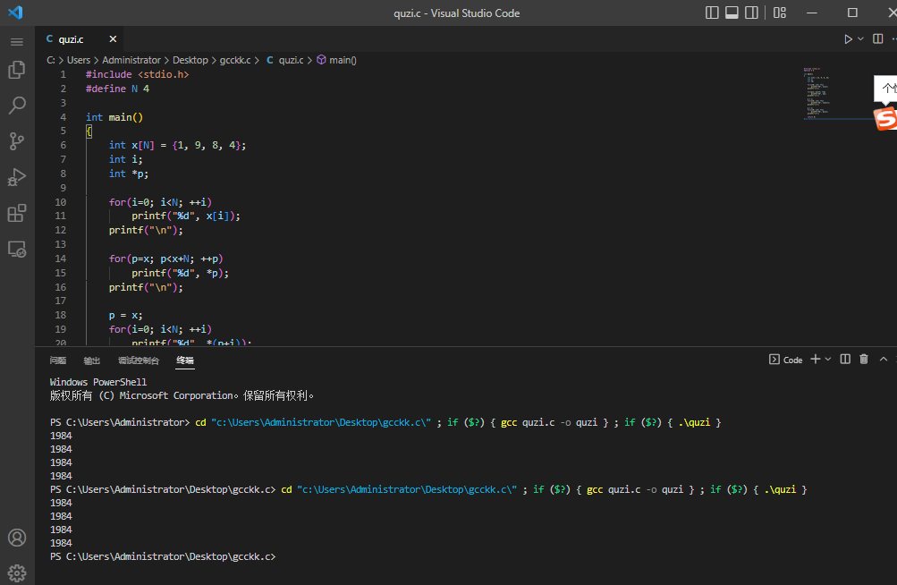 2:line7代码,能否替换成以下写法? char s1[]; s1 = "C, I love u." 答:不能. 3:line20-22执行后,字符数组s1和s2中的内容是否交换? 答:是. task3_2 #include <stdio.h> #include <string.h> #define N 80 int main() { char *s1 = "C, I love u."; char *s2 = "C, I hate u."; char *tmp; printf("sizeof(s1) vs. strlen(s1): \n"); printf("sizeof(s1) = %d\n", sizeof(s1)); printf("strlen(s1) = %d\n", strlen(s1)); printf("\nbefore swap: \n"); printf("s1: %s\n", s1); printf("s2: %s\n", s2); printf("\nswapping...\n"); tmp = s1; s1 = s2; s2 = tmp; printf("\nafter swap: \n"); printf("s1: %s\n", s1); printf("s2: %s\n", s2); return 0; } 1:指针变量s1中存放的是什么?sizeof(s1)计算的是什么?strlen(s1)统计的是什么? 答:字符串首地址;字符串首地址的存储大小;字符串长度. 2:line7代码能否替换成下面的写法? char *s1; s1 = "C, I love u." 答:可以. 3:line20-line22,交换的是什么?字符串常量"C, I love u."和字符串常量"C, I hate u."在内存存储单元中有没有交换? 答:s1和s2的地址;没有交换.