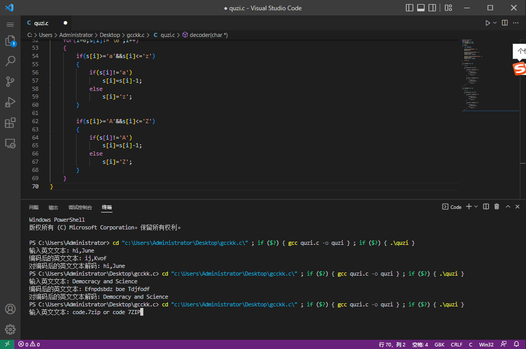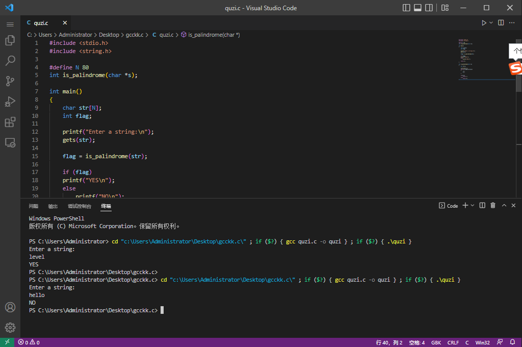 #include <stdio.h> #include <string.h> #define N 80 int main() { char s1[] = "C, I love u."; char s2[] = "C, I hate u."; char tmp[N]; printf("sizeof(s1) vs. strlen(s1): \n"); printf("sizeof(s1) = %d\n", sizeof(s1)); printf("strlen(s1) = %d\n", strlen(s1)); printf("\nbefore swap: \n"); printf("s1: %s\n", s1); printf("s2: %s\n", s2); printf("\nswapping...\n"); strcpy(tmp, s1); strcpy(s1, s2); strcpy(s2, tmp); printf("\nafter swap: \n"); printf("s1: %s\n", s1); printf("s2: %s\n", s2); return 0; } 1:数组s1的大小是多少?sizeof(s1)计算的是什么?strlen(s1)统计的是什么? 答:s1-->13 sizeof(s1)计算的是字符数组的大小;strlen(s1)统计的是字符串的长度.