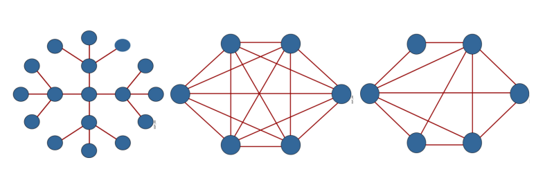 星型拓扑:通过中心点传输,单一故障点
