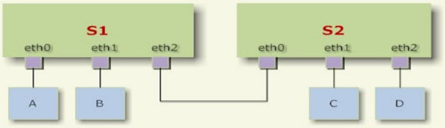 eth1和eth2,并且发送出去,然后被主机B和交换机S2接收到。而S2又会将报文转发给主机C、D