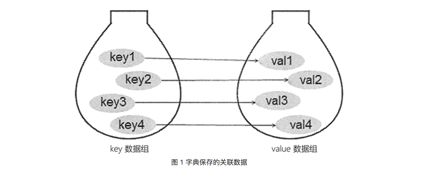 如果单纯使用两个列表来保存某组数据,则无法记录两组数据之间的关联关系,为了保存具有映射关系的数据,Python 提供了字典,字典相当于保存了两组数据,其中一组数据是关键数据,被称为 key;另一组数据可通过 key 来访问,被称为 value。形象地看,字典中 key 和 value 的关联关系如图 1 所示:
