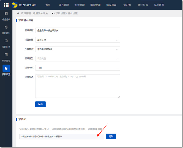 - 首先,我们需要在奇安信开源卫士中创建一个项目,并且获取到对应项目的GUID,如下图: