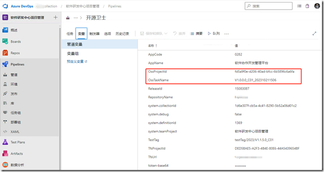 - 由于笔者使用接口自动触发流水线,实现自动扫描,所以在流水线中创建了两个变量OSSProjectId、OSSTaskName;OSSProjectId用于映射前面创建的项目,例如笔者对应的是一个系统名称;OSSTaskName用于建立项目中的每次扫描,例如笔者对应的每个版本;
